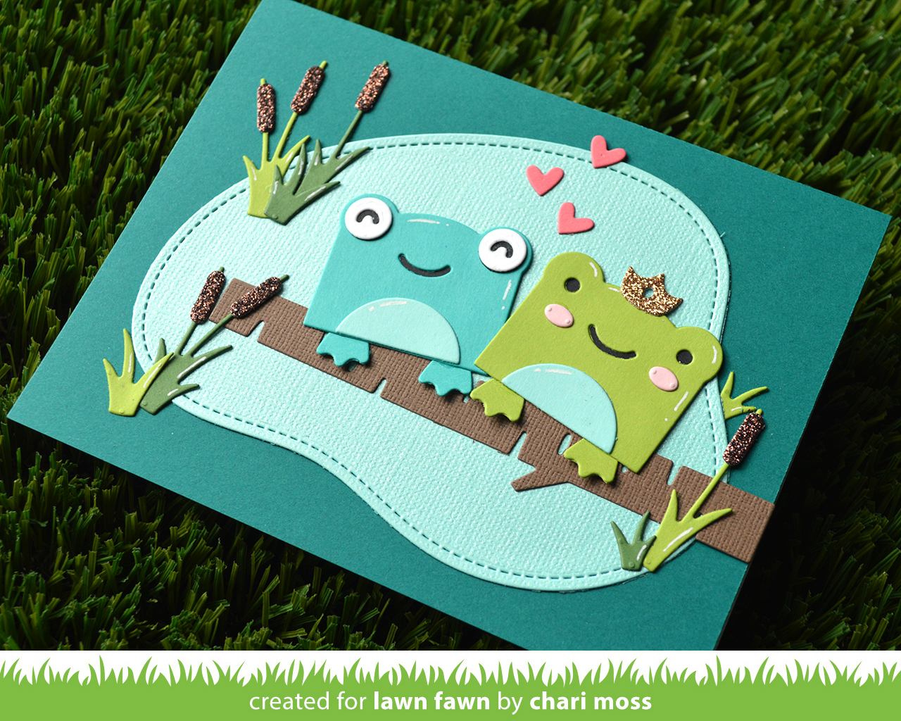 First up is a cute little die cut card using the new Tiny Gift Box Frog Add-On. I used the birch trees die for the log, the stitched pond die for the pond, and cattails and grass from the Stitched Pond Frame die set.